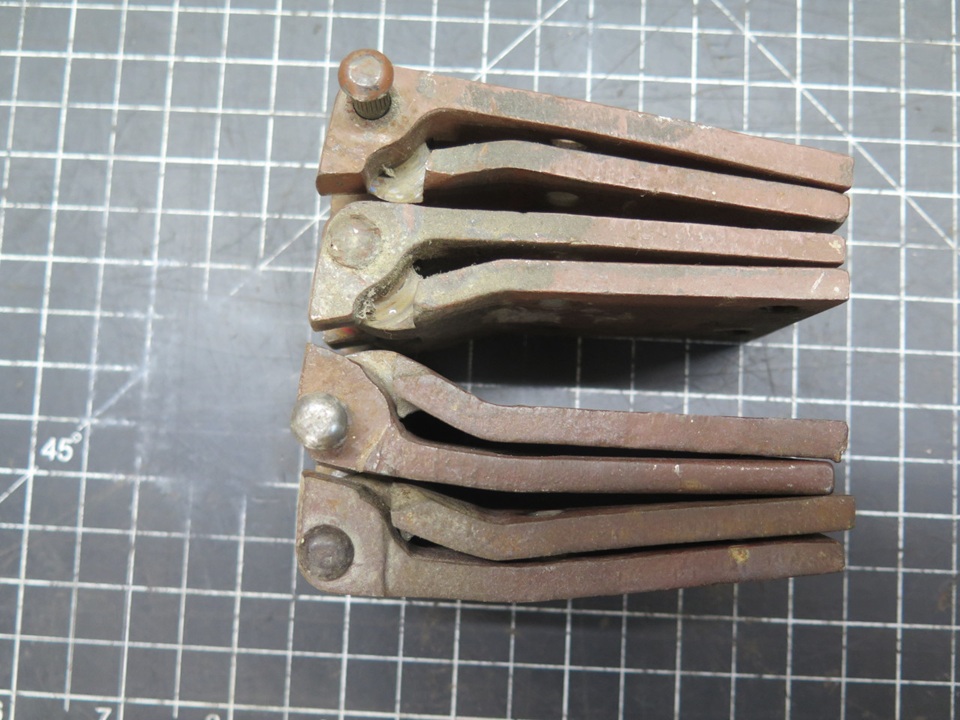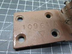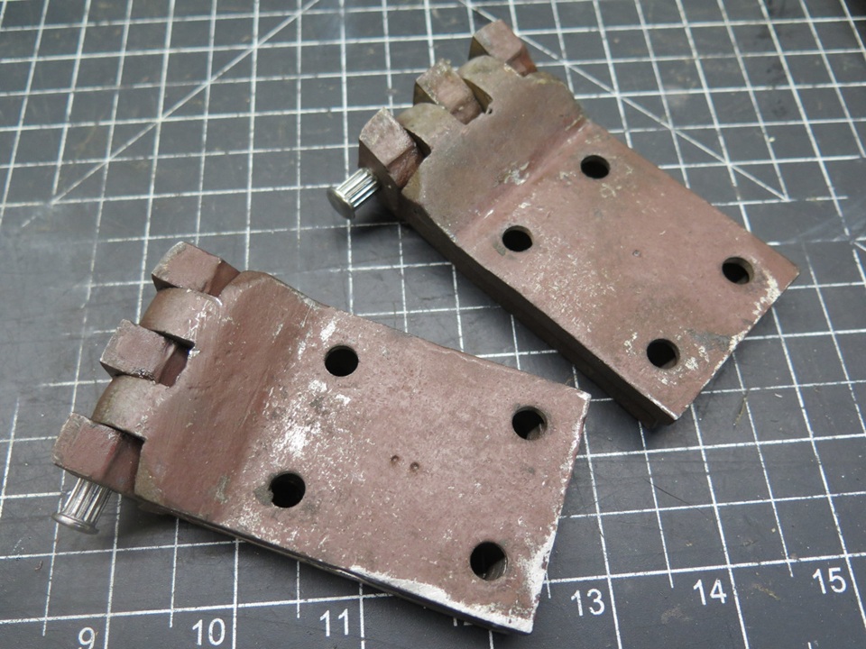 My hinges seemed to be OK in outward appearance. I noticed they were of two types. One pair had number markings on them that identified them as factory parts. The other pair had no such markings, telling me that they were probably aftermarket replacements. I wish I had marked their locations on the car when I removed them, but I didn't. My theory is that the factory pair came from the passenger side, where they got much less use, while the driver's side had the replacements.