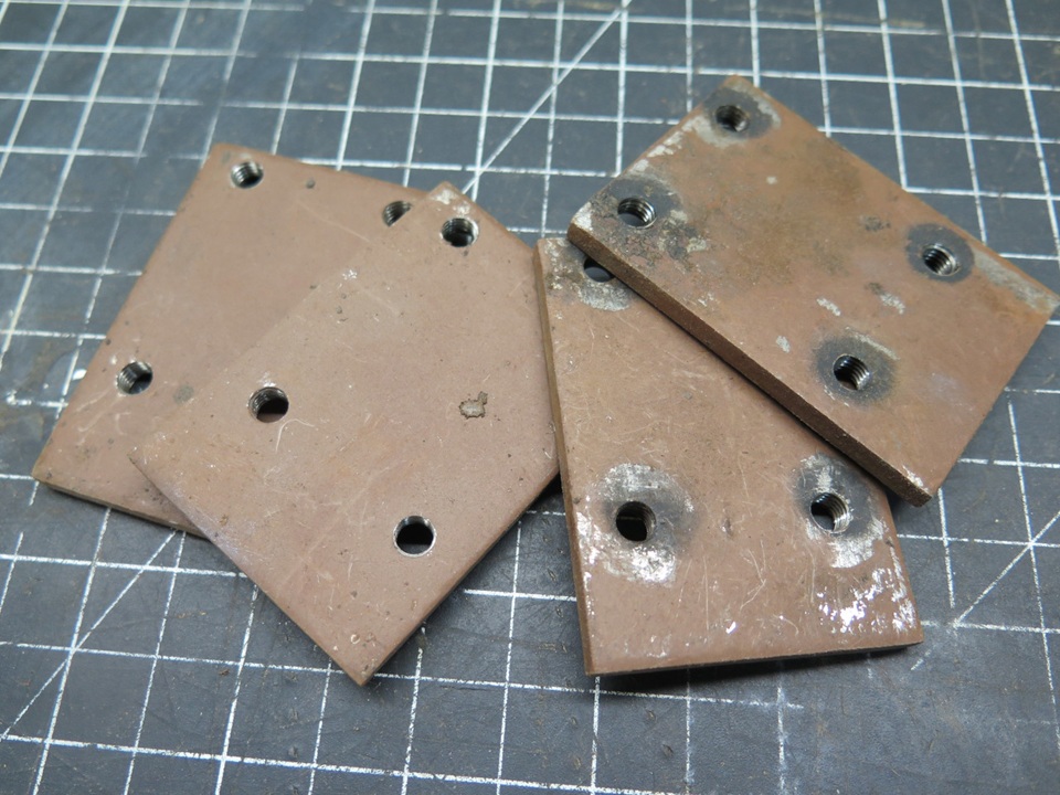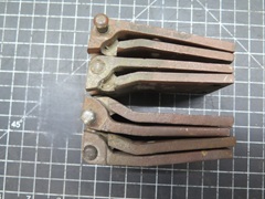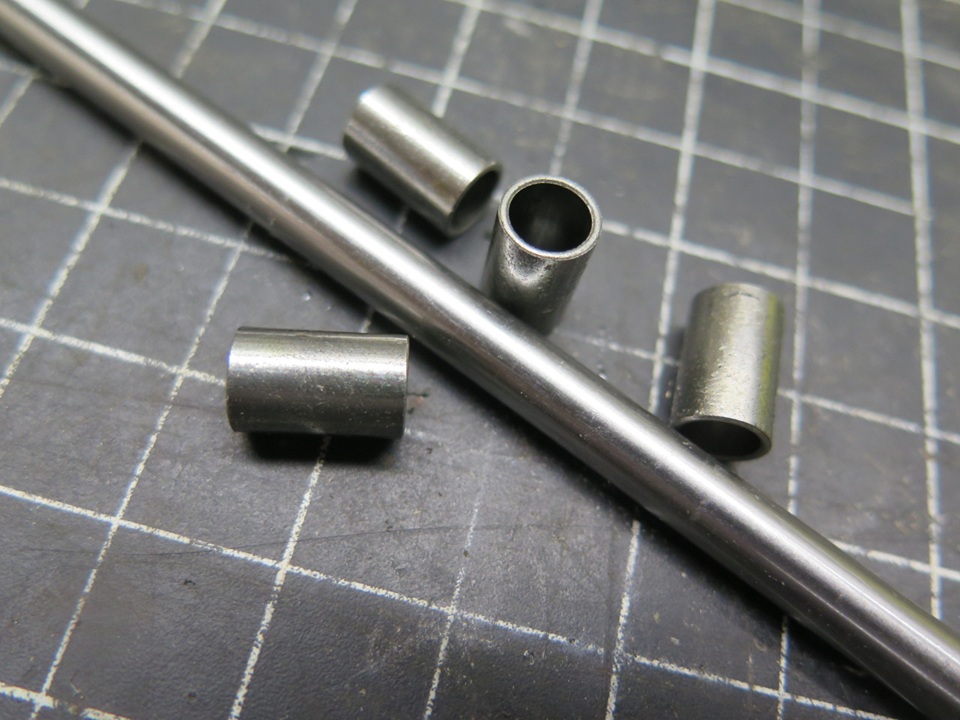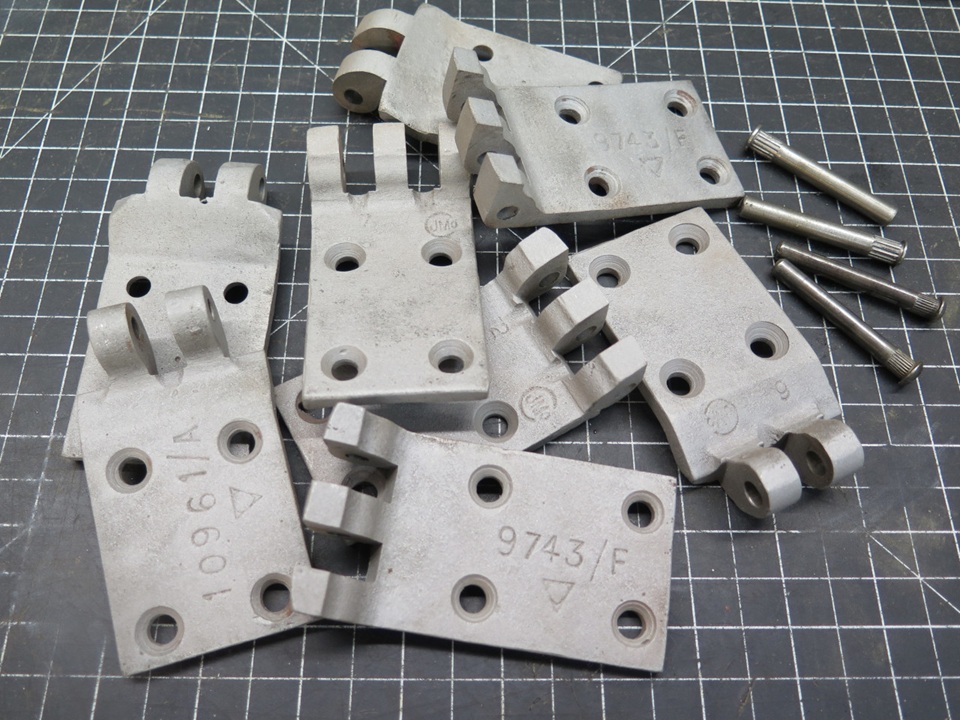 I decided to try to renew the replacement hinges. My first plan was to enlarge the bores to accept new bushings to bring them back to standard 1/4" ID. I bought come sintered iron bushes and some 1/4" precision stainless steel rod for the pins.
