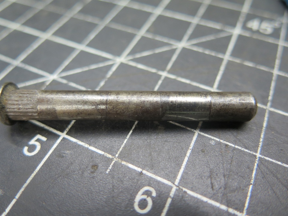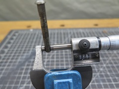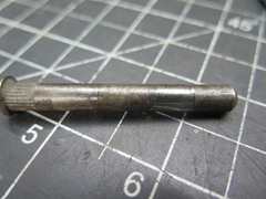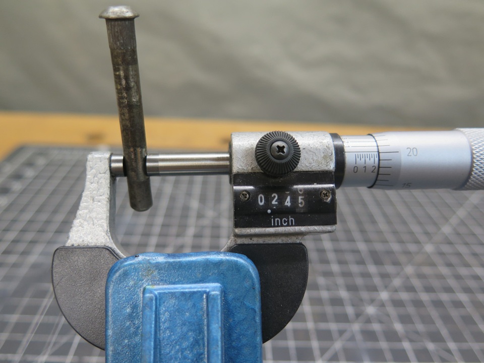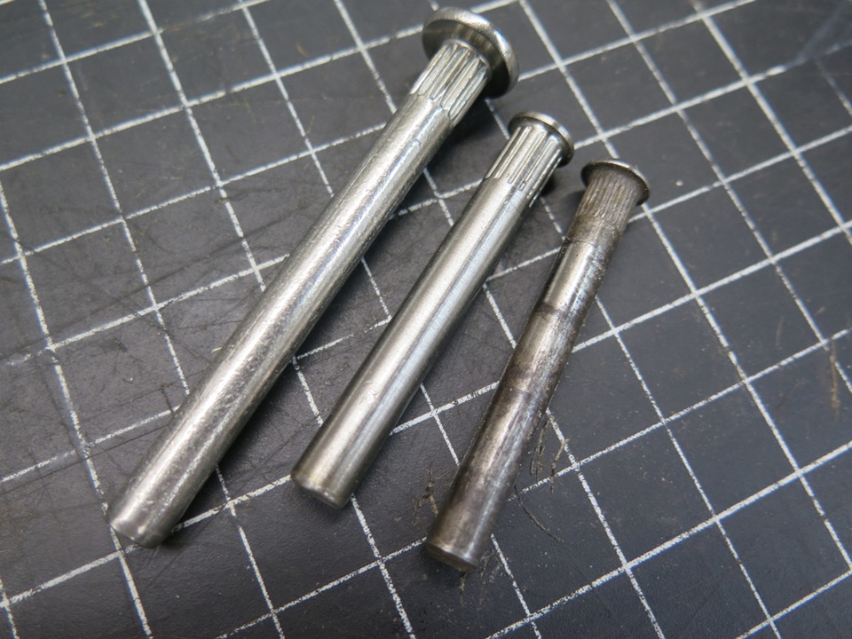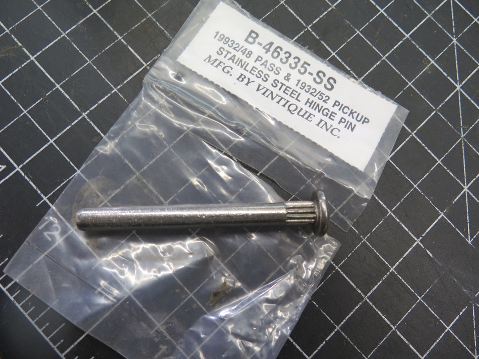 Possibly someone somewhere makes oversized pins for MGA hinges, but I didn't find them. I did a wider search. The pins needed to be larger than the original 1/4", but not too much larger, because of the limited size of the knuckles. I finally read that pins for old Ford pickup trucks might work. I ordered some. They are stainless steel. These pins measured between 0.277" and 0.278"--just big enough to remove any wear in the bores.