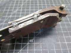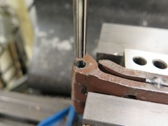 I put an old pin in the bore, and added some spacers between the leaves to make them parallel, then tack welded the leaves together. This was ensure that the bores stayed aligned when the pin was removed. Then, after aligning the bore in the vice, drilled and reamed the bore with a 0.2785" reamer. This made a nice fit for the new pin.