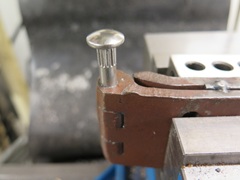 After freeing up the leaves again, the hinge moved freely, with no detectable play. There were a few more things to do though. The new pins had a much too aggressive knurl under their heads, and the heads were way too big. They were also about 1/2" too long. All of that got fixed. Tested to make sure the knurl would go in the bore, then brought the other hinge to the same state.
