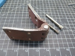 The doors on the MGA are really light by modern standards. First, there is essentially no machinery inside, not even window regulators or door locks. Second, they are skinned with aluminum, which saves a few pounds. The door hinges have a pretty simple job, so they are dirt simple--just a pair of flattish leaves with fingers and a pin to hold them together. They also incorporate a built-in stop feature to limit how far they will open.