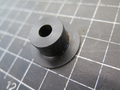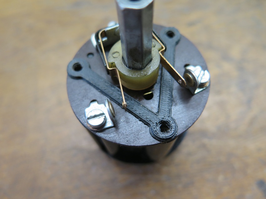 I treated the piston lip and the bore with some fairly heavy silicone grease, and assembled the cylinder and piston. I was glad to see that by totally sealing the bleed port, I could get enough vacuum to hold the piston for nearly a minute. -- Before putting the cylinder assembly back into the outer housing, I had one concern: The 0.050" flange of the new nose might contact that white plastic switch cam, and could keep the cylinder form seating in the housing properly. My solution was to add three little 3D printed 0.050" spacers over the screw holes in the cylinder. This would lift the outer housing slightly to maintain clearance to the cam.