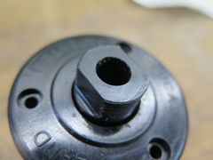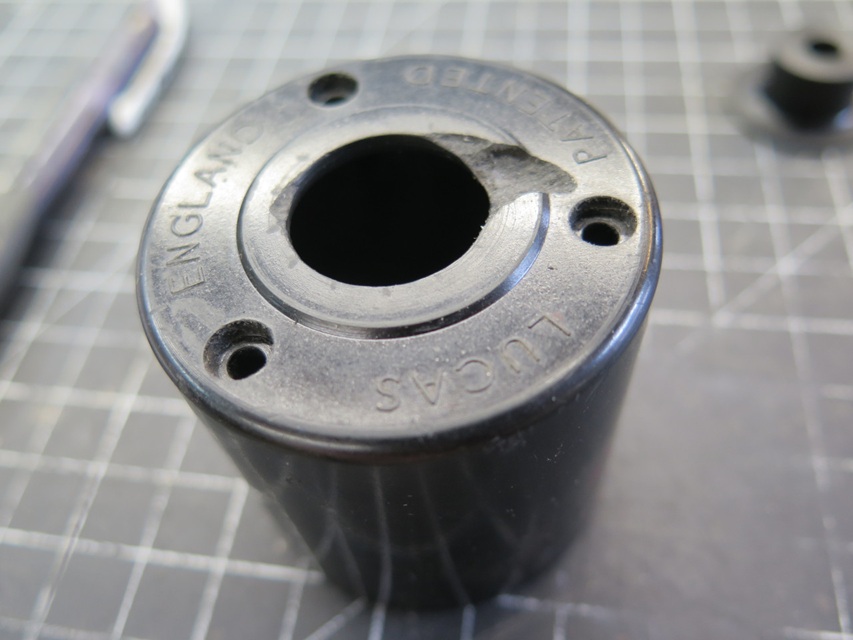Before I spent any time on the piston or bore, the broken mounting nose seemed like a more pressing problem. -- I made a new nose with a thin flange. The idea was to glue the flange to the inside of the housing, with the nose protruding. I wasn't sure if this would work, but I had no better plan. I could determine the diameter of the nose from the hole in the dash (3/4"), but the length was sort of a guess from pictures found online. -- The body had to be bored out for the new nose to pass through.