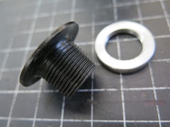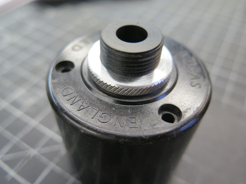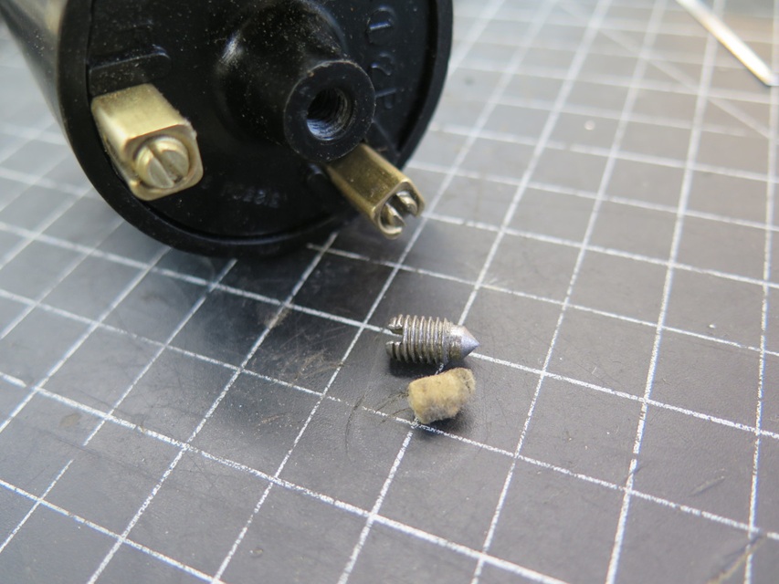 The bleed hole boss gets packed with this little cotton plug, which is in turn compressed by a set screw. This apparently serves as a rough adjustment for time delay. -- One little detail that I didn't notice until the end was the missing set screw in one of the electrical terminals. I only mention it because it turned out to be non-trivial. First, it's brass, which isn't typically an common hardware store item. Second, what appeared to be a very common 1/4-28 UNF thread was in fact a 1/4-26 BSF thread. The project was on hold for a week waiting for the die, but there it is, the new screw on the right.