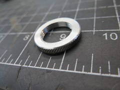 This looked promising, so I threaded the nose. Based on pictures, the thread pitch looked to be finer than 16 TPI, which is the UNF thread for 3/4" diameter. I think it should be 3/4-24, but a 3/4-20 die was way easier to find, so that's what I used. It seemed quicker to also make the fixing nut rather than trying to find someone selling it.