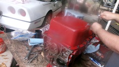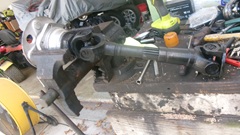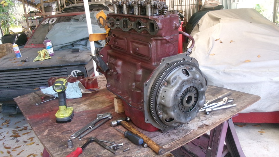 From the rear ,remove clutch, flywheel and engine rear plate. From the front remove crank pulley, fan, water pump, alternator and a few more small bits we will need to install the "loaner" engine. By 1-pm the 1800 engine was half naked.