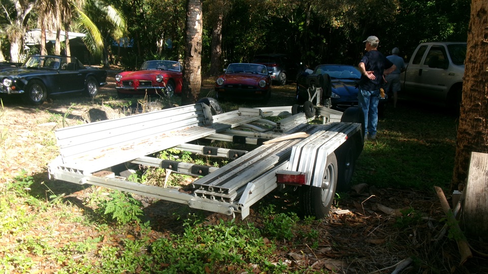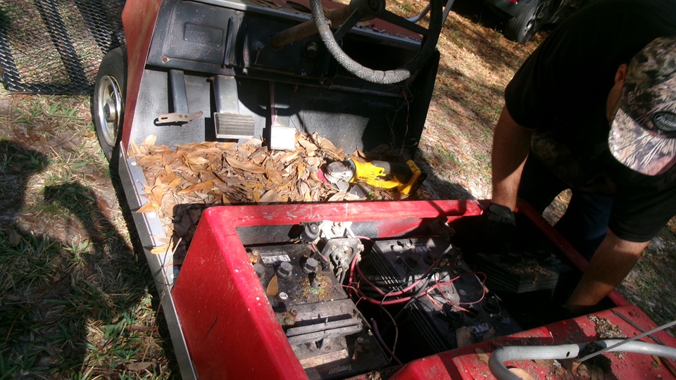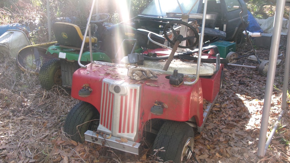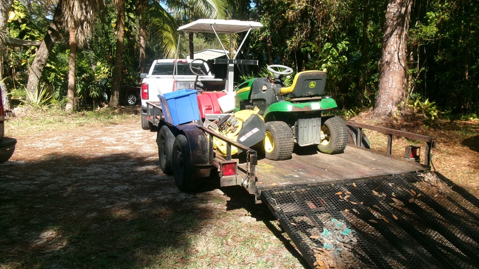 Cut battery cables and pull the batteries out of the golf cart before pushing it onto the trailer. Shove the lawn tractor up behind it with some related tractor parts and other miscellaneous scrap. Enough for one trip, the trailer will be back tomorrow to get the dead VW.