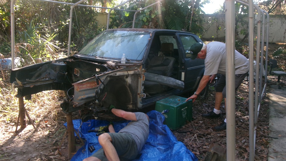 Before the junk VW could be hauled out, they were removing the front suspension cross member and lower A-arms. This was Jerry's pet project, as he had paid $100 to get those parts out of a junk yard once.