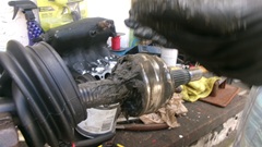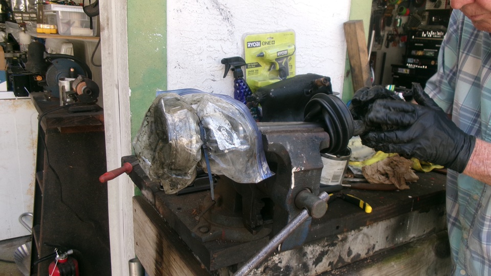 After lunch, most folks gone home. Back to the work bench to finish reassembling the VW halfshaft with new stub axle and CV joint (remember that one from last week). Need this to get the racing Rabbit back together.