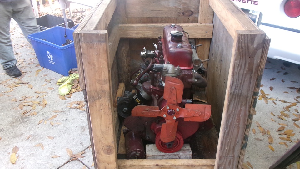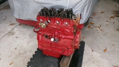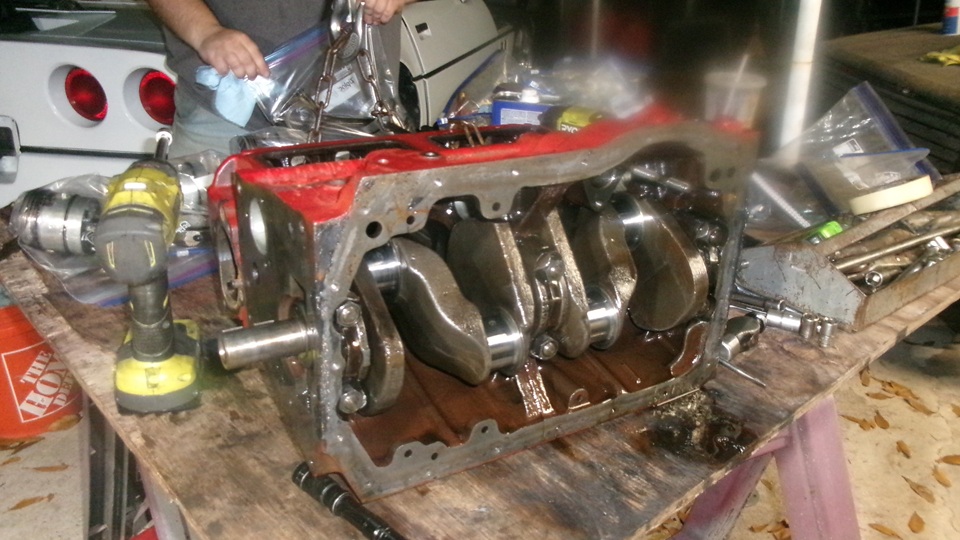 10-am start, drain coolant and oil, remove radiator, carburetors, manifolds, distributor and other peripheral bits. Disconnect bellhousing bolts and engine mounts, lift out, and by 2-pm the engine was sitting on a work table.