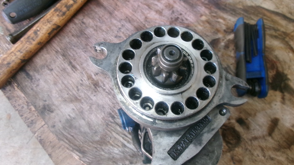 Slightly earlier start today, about 9-am. Time to throw all the bolts into the engine mounts, last few bolts in the bellhousing, intake and exhaust manifolds, hook up the exhaust pipe. Then a couple bolts for the starter motor before kicking it off the jack stands. That's where we ran into an unexpected problem. With the starter base plate bolted tight, the rest of the unit was wiggling bit. No good. take it back out for a better look.