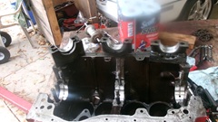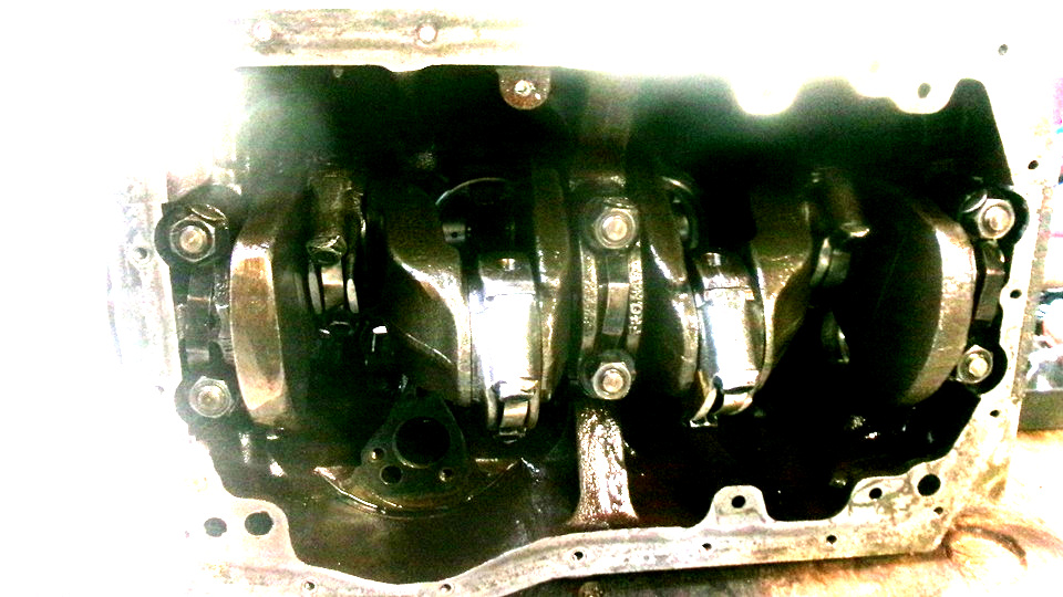 We cleaned this up a bit, then installed main bearings, crankshaft and pistons with con-rods.
