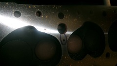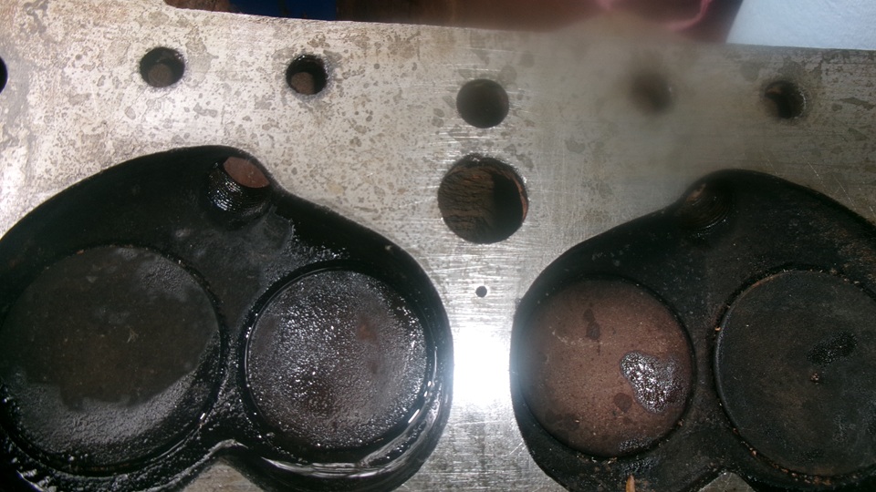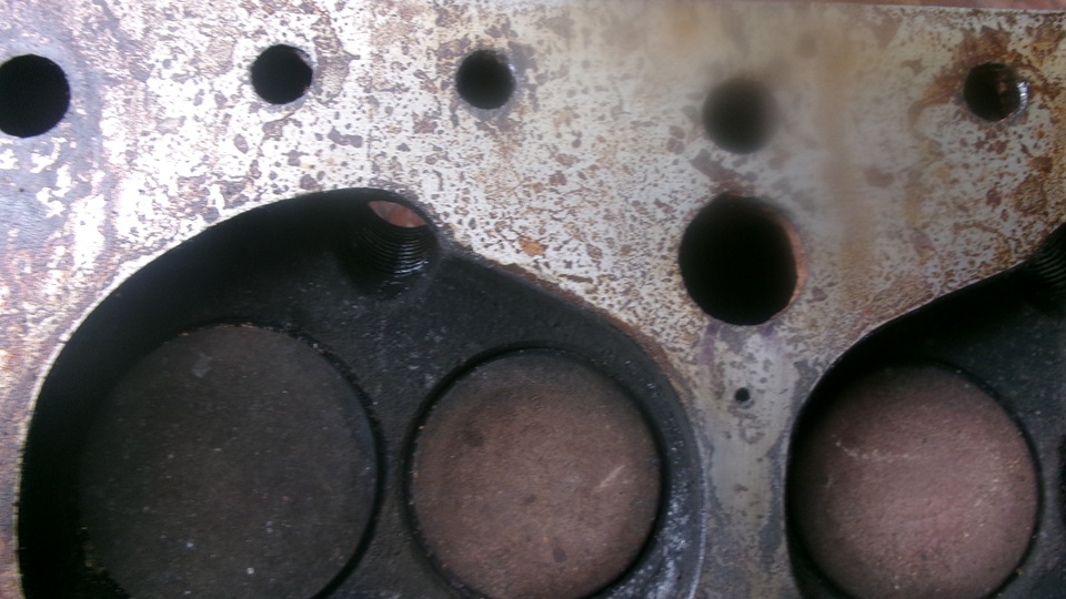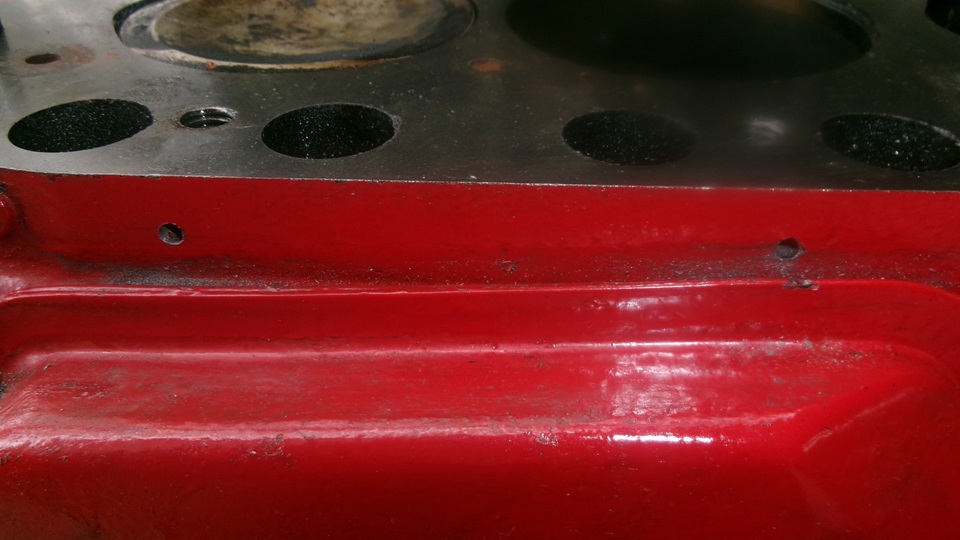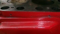 The machine shop had noticed a small crack in the head, starting from one of the water passage holes. Not a big deal, except you don't want the crack to run any farther, and maybe end up crossing onto a valve seat. The fix is to drill a small hole at the end of the crack so it will not progress any farther. In that location the head gasket will cover the drilled hole. Pictures with and without flash, before and after drilling. I was surprised how thick the head was t that point while drilling through into the water jacket, much thicker than it was at the water passage port. Since it rained last night, there was some rust on the fresh ground surfaces of the head and block. This looks better after running an oiled whetstone over it.