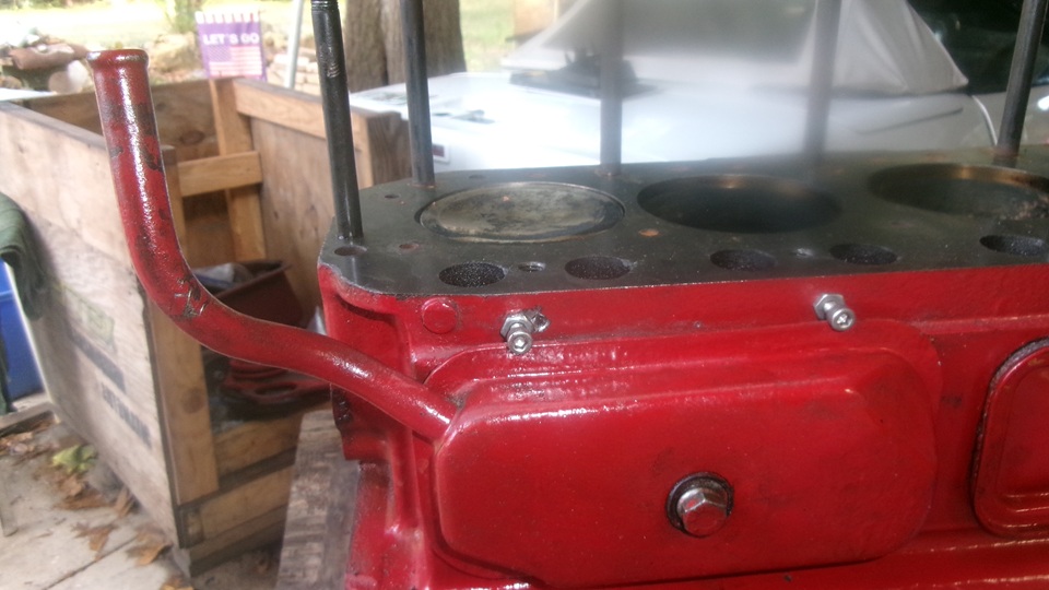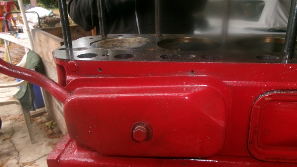 installed oil pump and pickup screen with drive gear, and button up the sump. Yes we can install the camshaft after the oil pump gear. Install the head studs, and flip it upright. Install the spin-on oil filter mount with external oil pipe, oil pressure relief valve, and few block side plugs, and temporarily mount the tappet covers just to keep dirt out. By then running out of daylight again. A quick side note on the cylinder head. There was one small crack in the bottom face from one of the water passage holes into the water jacket. Easy fix is to drill a tiny hole at the end of the crack to stop it from running any farther, and the head gasket will cover and seal the little drill hole. Will take care of that later.