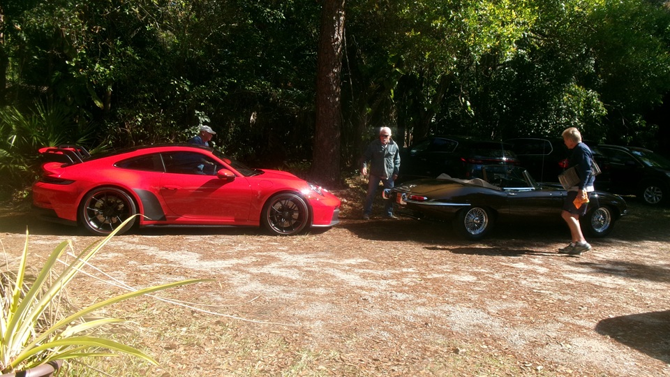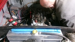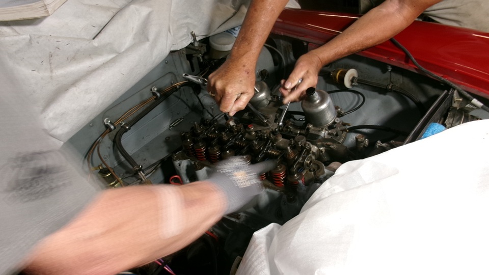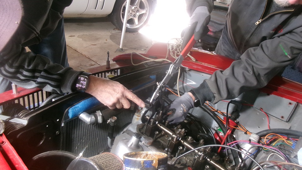 They have this neat 4-bolt plate tool to attach to the carburetors to R&R them as an assembly, keeping the choke and throttle linkages together. During the process they did not find the half piece of the split cotter, so either it never fell in, or it may have found its way down though an oil drain hole to the sump, where it will do no harm anyway. Once the tappet cover was reinstalled, and the manifold and carbs were back in place, it was enough for one day. When almost everyone had left, two more friends of the friends showed up with a Porsche GTS and a Jag E-Type. Hello and goodbye, lock up and we're out of here.
