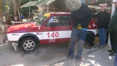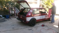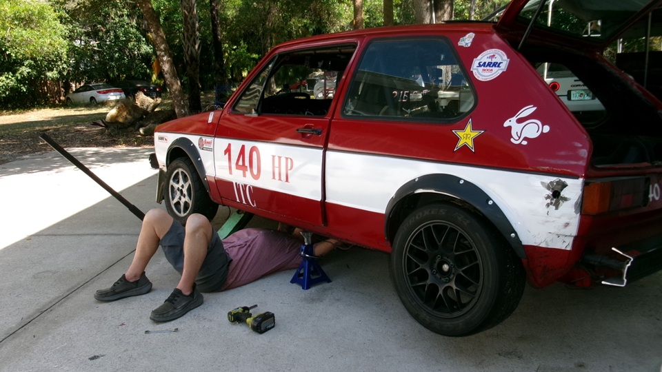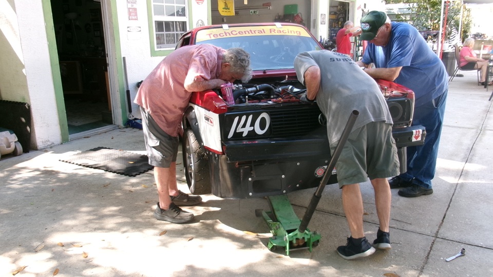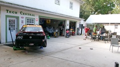 Good morning Tech Central Racing. Don't be fooled by two VW with the same racing number. They never get out on the same race dates.The one on the forecourt is the Rabbit that returned from Daytona with a broken shifter last week end. On the lift in the shop is the Scirocco with engine out for a while, and Jerry in the back tinkering with the engine.