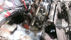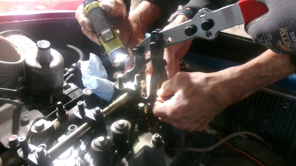 My new radiator that doesn't fit has been moved farther back on top of something else, because the guys wanted to use the engine box as a work bench. Tina, the MGB race car was getting some attention. This is the second Friday they have been trying to change valve springs from single to double springs. They do have all of the correct parts required, but they are still going to the School Of Hard Knocks, trying to change the valve springs without removing the head. Just a hobby, maybe, as they want to spend more time than money, to save the cost of a new head gasket. Today they removed the rocker shaft assembly (loosening four head bolts) to remove the rocker arms, then reassemble the shaft and pedestals.