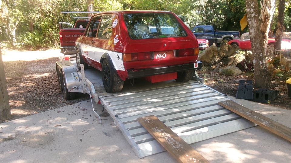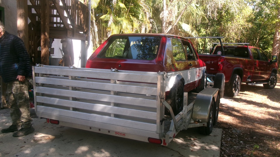 The new compact digital camera was waiting for us at Tech Central, unpack, assemble, and plug it in to charge the battery. While it was charging, still taking pictures with the old camera with no flash and failing display screen.-- The flat bed trailer was ready to load a car, heading off to race at Sebring this week end. The VW Rabbit in final prep and packing. It was running okay, but we put it up on roller dollies to move it across the forecourt, because it is easier to hand push it rather than maneuvering a high tempered race car in tight quarters.