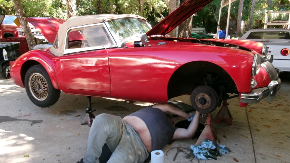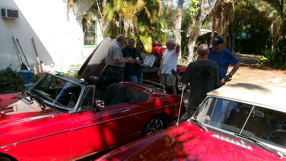 on Fri Jan 3 we were working on right rear brakes of an MGA 1600-MK-II Coupe at Tech Central. On Jan 30 we were checking out the stuck bonnet latch while the car was in for paint touch up in Bonita springs, FL. Today we were off to Fort Myers, FL to visit the red Coupe at its home base where we had a drive-on lift to help with access to the stuck bonnet latch. The Coupe drove home from the paint shop, but died at the door before entering the shop. Turns out it ran out of fuel, so a few gallons of gas got it running again, so it could be driven onto the lift.