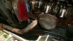 One rod at a time, not to mix up any parts, not long to swap out the half shells in four rods and get the bolts torqued up and locktabs reset. While the oil pump was out, it was the opportunity to R&R the pump mounting studs for measurements to verify overall length and length of threads on both ends. One stud was long enough, but with too much thread on the bottom end it screwed in to bottom out in the tapped hole, a bit too far, ending up with just enough length to install the hex nut. The other two studs were a tad short, as well as having too much thread at the bottom end. Those had to be backed out two turns to be long enough to install the nuts. Since we put a new oil pump in this one few weeks ago, we had the information and foresight to order new studs, so now it has the correct parts, and I have the correct dimensions for my new Part Numbers web pages documenting all of the threaded studs used in the MGA cars (to be finished soon).