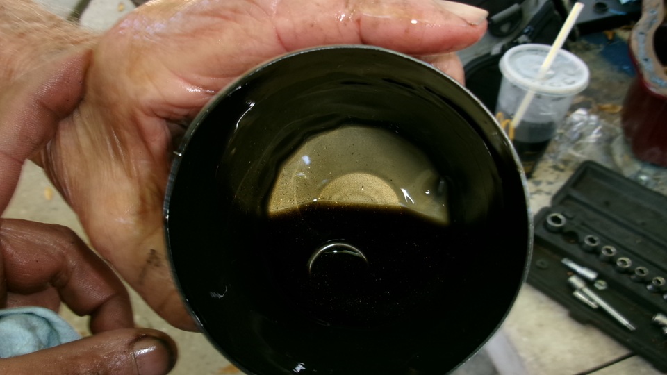 There is the picture of all of the old half shells. #4 looked pretty good, #3 had the most copper showing, but the crank pin journals still looked okay, glad we caught this when we did.We cut the oil filter open to see what we could find inside. the oil didn't look too bad, but there is a little spring in that picture that was part of the filter assembly, likely for the bypass pressure relief valve in the filter. Cutting the filter material loose to fan out revealed lots of debris like fine sand, particles small enough to slip through the mesh of the oil pick-up screen. The sump had more debris in larger particles that wouldn't fit through the pick-up screen. Again, glad we caught this issue when we did. We may chat later about why the rod beings may have failed. Just enough time to clean the oil pan and get it reinstalled before dark (with the two bottom bellhousing bolts. Spin on a new oi l filter, Fill with oil, and crank it 40 seconds with spark plugs out until it was showing oil pressure. We also did a compression test before installing the plugs and firing it up. All is well that ends well. Adjust the front brake shoes before reinstalling the wheels, kick it off the stands, pack up and on out way by 7-pm.