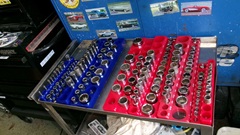 Some of the guys, not too busy, having a committee meeting, scratching heads, no doubt chatting about the TR6 again (the never ending issue). Another repetitive issue, sorting sockets, because people never put them back where they belong. Seems like they have now procured some better socket clip strips, easier to use. An hour later things were looking much more organized.