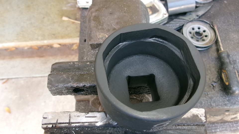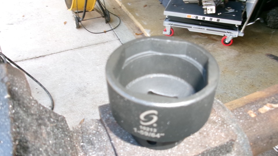 the 1/2' drive tool box with other moderately large sockets, while the really big (and expensive) blue tube socket (poor quality) is being relegated to the metal recycling bin to free up some space in a large tote box in the trailer. Jerry still has another big blue socket hanging on the wall in his shop, still clean like it was never used (and maybe never will be used).