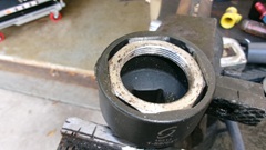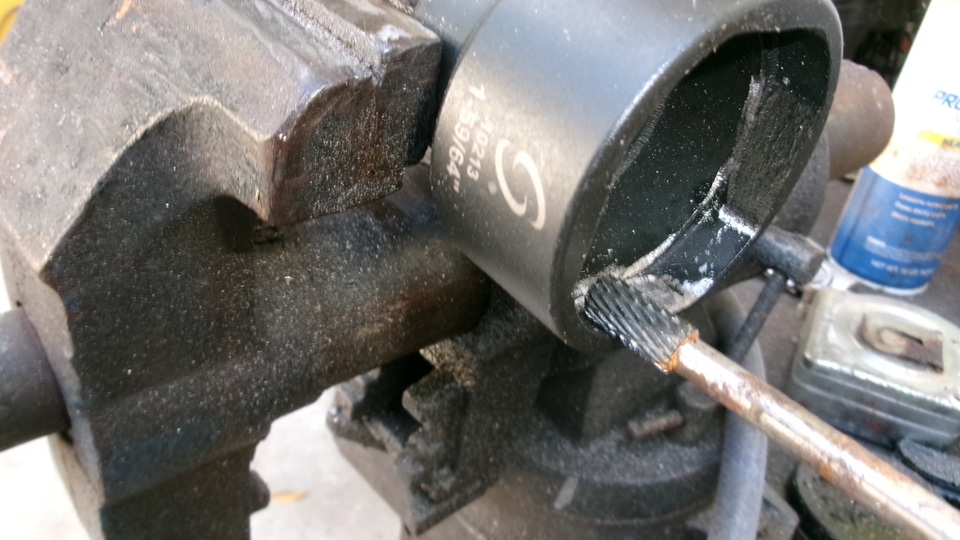 On to my more interesting task for the day, "porting out" the new 1-59-64" 4-flat wrench socket to fit the 1-15/16" octagonal nut for the rear wheel bearing hub. I have never ported a cylinder head, but at least I get to use the tools. Enter the air powered die grinder, which might be overkill, but sure makes this job easy.