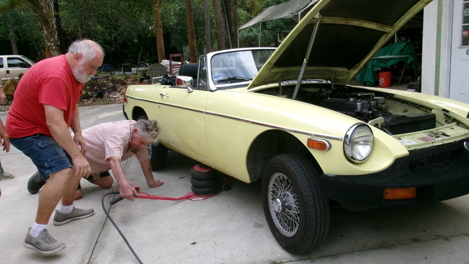 the guys got to work with the pneumatic bellows jack, which actually works quite well once you get the hang of it. Sometimes it may seem a little wobbly half way up, but it is easy to use and has nice high lift. Just be sure to use a good jack stand along with it. With one guy pushing pedal, one guy working a vacuum bleeder, two guys regularly refilling the small clutch master cylinder reservoir, it wasn't long to get the job done, and the clutch works well with no new parts required.