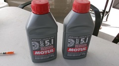 Then there were two half liter bottles of DOT 5.1 brake fluid. This stuff is glycol based fluid, one step up the performance scale from DOT-3 and DOT-4 fluid (definitely not DOT-5 silicone fluid). Apparently Jerry noticed some brake fade on his last race outing with the racing Rabbit, possibly due to some water absorption in his DOT-4 brake fluid (which had not been changed for some time). So he thought it might be good experience to try the DOT-5.1 fluid, just for kicks.